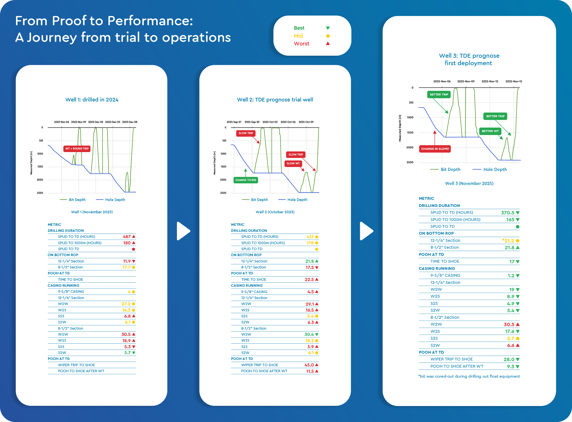 Taken together, these results support a compelling next step: further deployment of TDE prognose across the operator’s rig fleet to improve performance consistency and operational efficiency. With proven time savings in full deployment mode, the case demonstrates